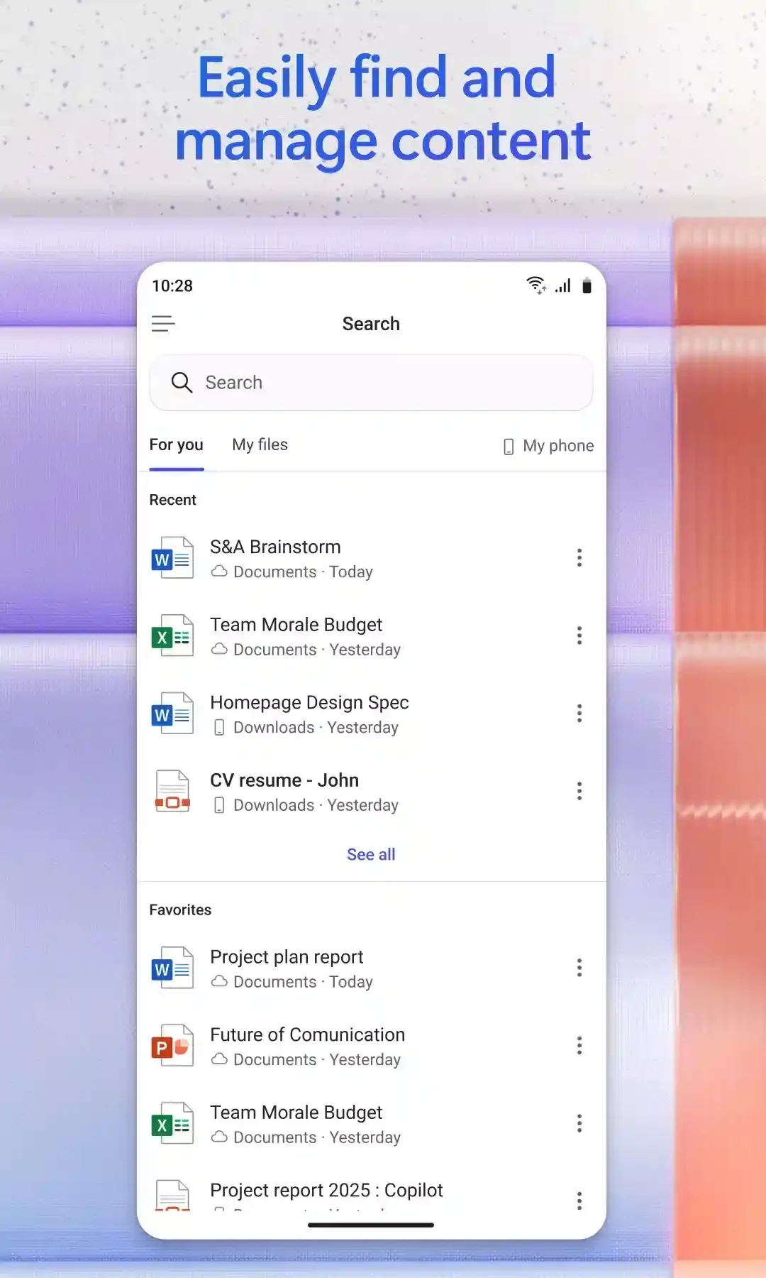 مايكروسوفت أوفيس 365 لنظام أندرويد عبارة عن حزمة برامج مكتبية مجانية تتضمن جميع تطبيقات الإنتاجية الشائعة التي تقدمها مايكروسوفت. وهي من أكثر المنصات موثوقية لإدارة مهامك الشخصية والمهنية. يتيح التكامل مع الخدمات السحابية الوصول السريع إلى سير عملك من أي مكان.